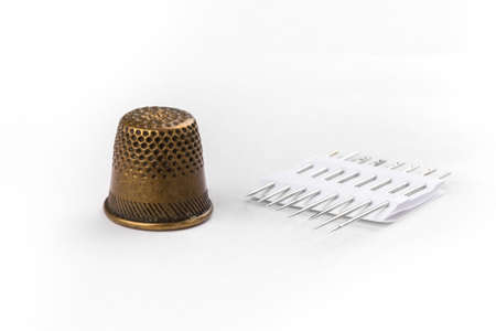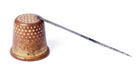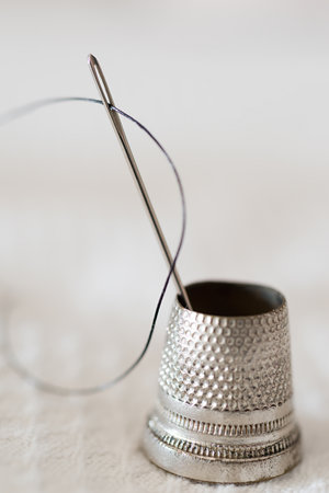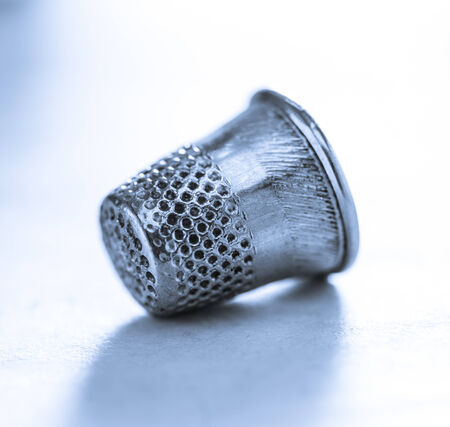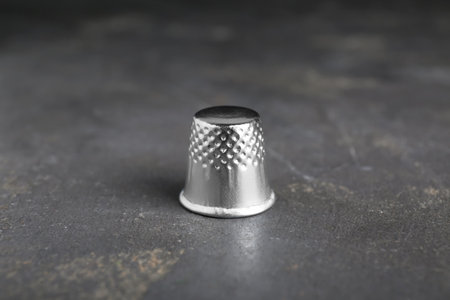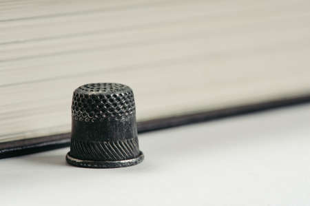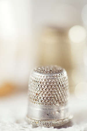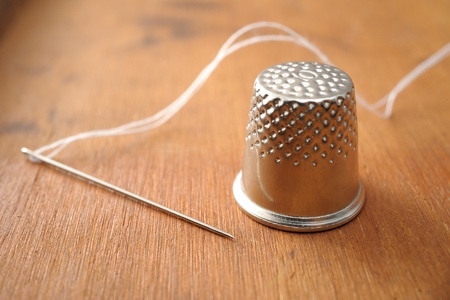 Thimble close up on a brown wooden table. Vintage style. Horizontal image.