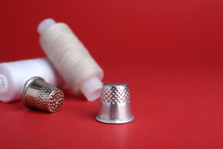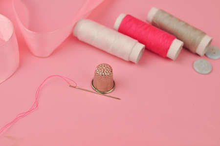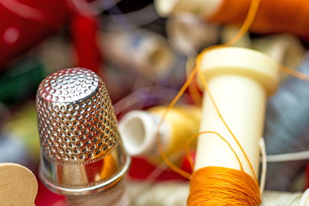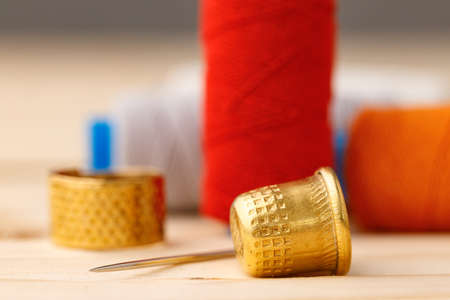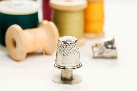 Sewing concept. Old thimble near spools of thread and wooden buttons