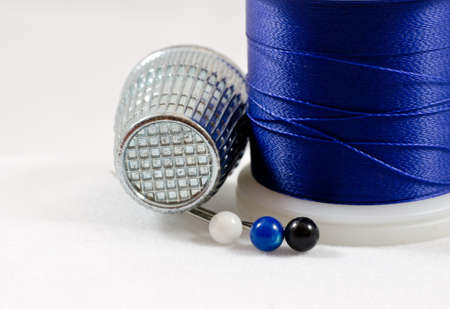 Metal thimble, sewing needle and spool of black thread on a white background.