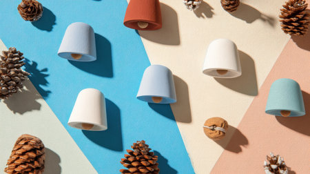 This image showcases a collection of colorful ceramic vases surrounded by natural pine cones on a visually striking geometric background, perfect for home decor inspiration.