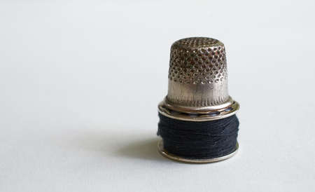 Sewing supplies. Thimble and bobbin with black threads close up on a gray background