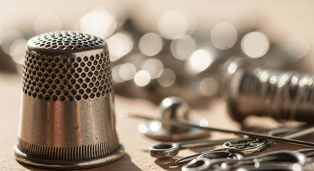Silver thimble and other sewing accessories on checkered cloth, closeup