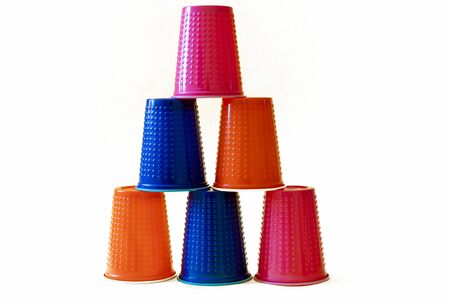 Multi-colored blue, orange and pink plastic cups on a white background. Tower wall made of plastic glasses. Plastic pollution concept.