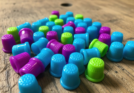 Colorful rubber thimbles standing against a plain background