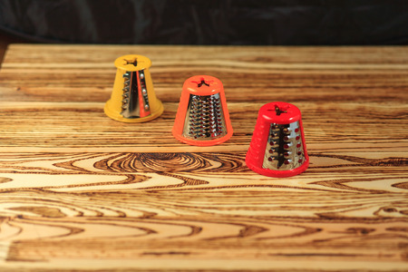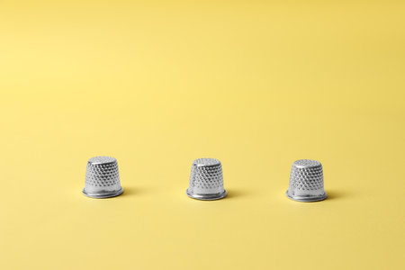 Aligned group of thimbles of different sizes on an orange surface with a blurred background