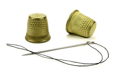 Old brass thimbles and thread with a needle for sewing on a white background