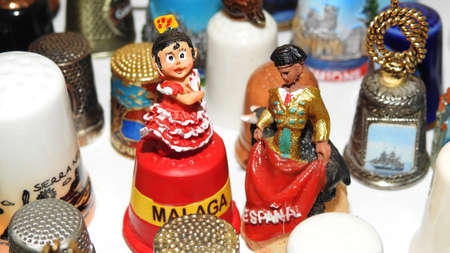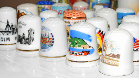 A lot of white souvenir thimbles on white table.