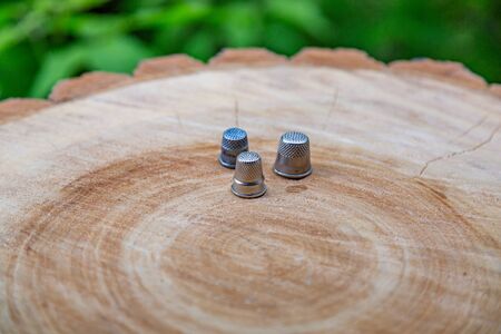 Thimble close up on a brown wooden table. Vintage style. Horizontal image.