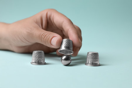 Woman showing metal ball under thimble on light blue background, closeup. Thimblerig game