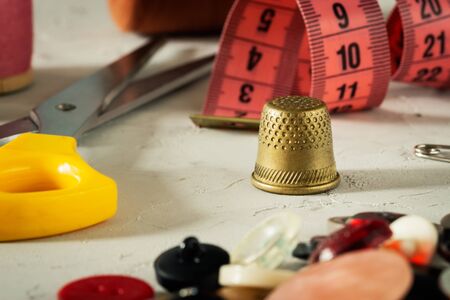 Thimble close-up against the background of things, centimeter and thread. Cutting and sewing concept.
