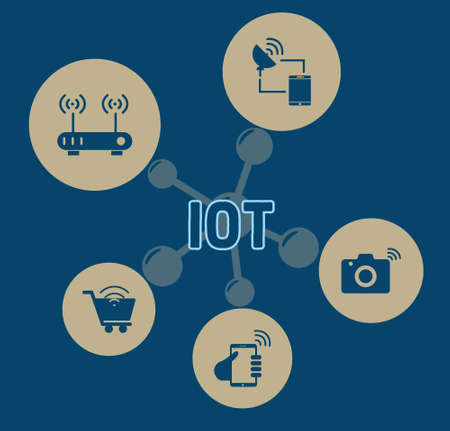 IOT concept design. Symbol IOT connected with icons of typical on dark blue background.Internet of things user connecting interconnecting with everyday objects with network.