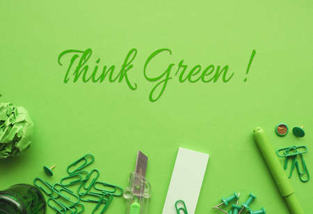 Text Think Green with office utensils on a green paper background, environmental concept