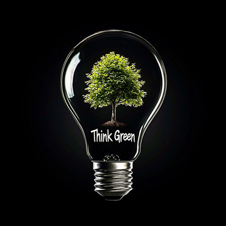 AI Generated - Light bulb with a tree inside and the words Think Green written on it, set against a dark background. Commercial illustration artwork for business applications. High resolution.