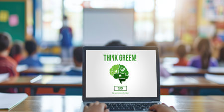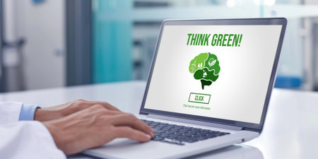 A bold sign stands prominently against a bright blue sky, encouraging passersby to embrace eco-friendly practices by thinking green. The message is clear and inspiring.