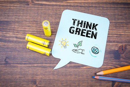Think Green concept. Speech bubble on a dark wood background