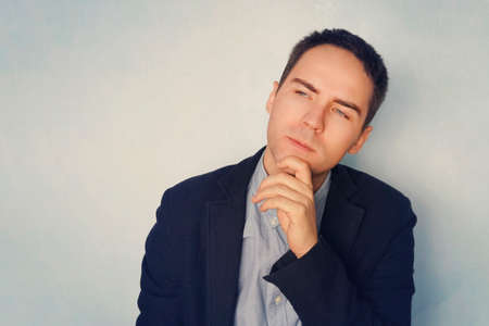 Thoughtful handsome male. A young businessman in a thoughtful pose reflects on business. Thinking through ideas and plans. A grown guy on a blue background.