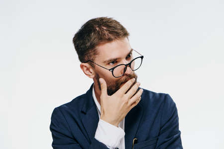 Portrait of a middle-aged man in a jacket and shirt, who looks thoughtfully to the side, Finger pressed to his cheek, beard, a little hair on his head, Caucasian