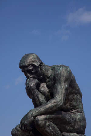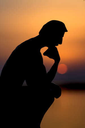 Sculpture thinking man in sunset silhouette. Concept photo.