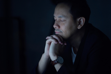 Asian man people in the dark Seeing he was thinking hard or anxious. In the eyes indicate stress and depression,Vintage mood and tone