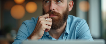 A thoughtful man with a well-groomed beard sits pensively, his hand resting on his chin, as he gazes into the distance. The warm, ambient lighting from blurred circular lamps creates a cozy atmosphere, enhancing the depth of his introspection and the subtle emotions reflected in his expression.