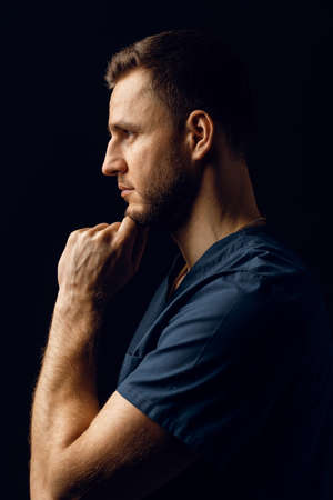Young man. Male portrait in profile on dark background.