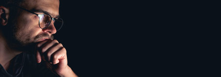 A young man reflects on his thoughts, his brow slightly furrowed and his hand resting on his chin. The dark background emphasizes his pensive mood and introspective moment.