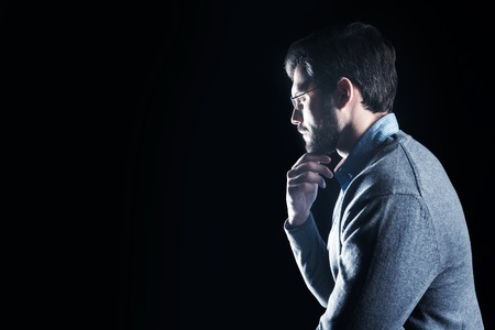 Serious thoughts. Serious intelligent handsome man wearing glasses and holding his chin while thinking about his problems