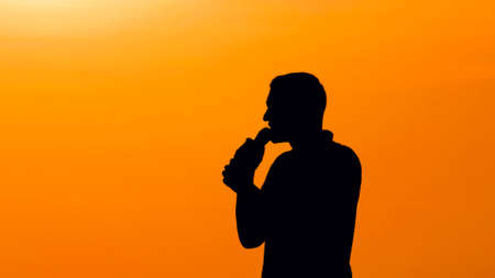 Unrecognizable man silhouette speaking into microphone on city street at sunset. Communication and public speaking concept