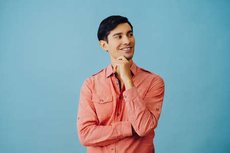 Portrait smiling handsome young adult latino man with arms crossed and hand on chin black hair and pink shirt over blue background looking away at copy space