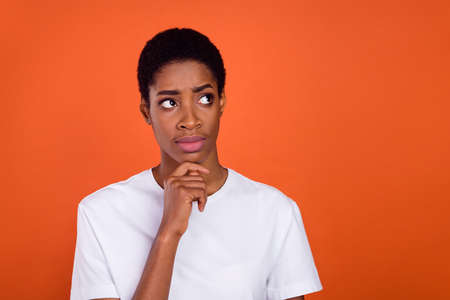 Photo of pensive androgyne woman touch chin decide solution wear t-shirt isolated over vivid color background