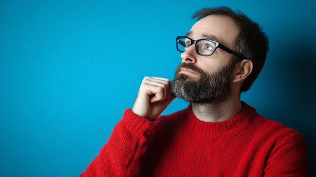 A man with a beard and glasses rests his chin on his hand pondering deeply against a vibrant blue background.