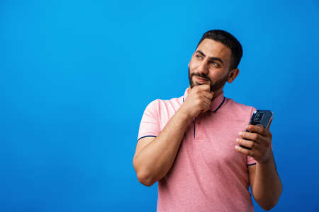 Narrow shot of happy pensive Indian man isolated on blue studio background look up thinking of good deal or offer. Smiling biracial guy consider copy space. Promotion and discount.