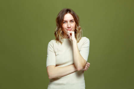 Pensive smiling young female with beautiful face looking at camera on green studio background. Natural woman beauty