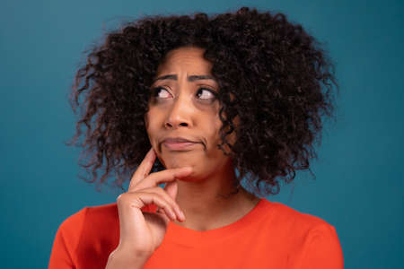 Thinking mixed race woman looking up on blue studio background. Pensive face expressions. Pretty afro model with attractive appearance.