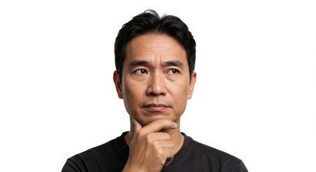 Thoughtful Asian Man in Black Shirt Looking Away in Deep Contemplation