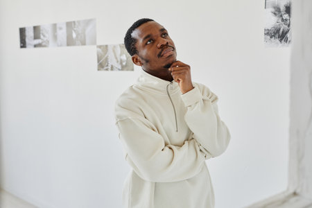 Waist up portrait of young African American man wearing white looking at pictures in art gallery, copy space