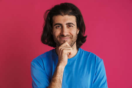 Headshot thoughtful handsome young adult latino man with hand on chin black hair and pink shirt over blue background looking at camera