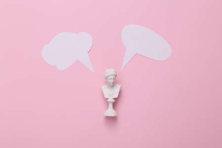 Bust Venus with dialog clouds on a pink background. Minimal still life