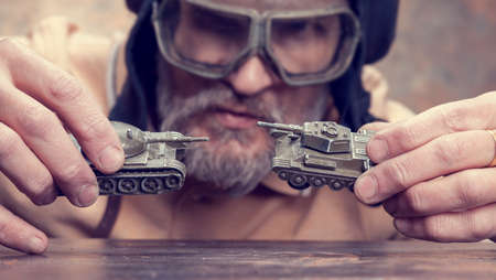 A bearded man with toy tanks in his hands. Front view.