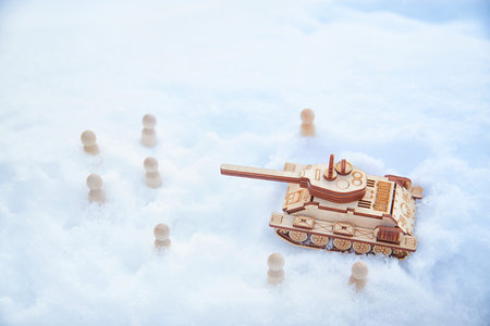 Wooden toy tank and little men in the snow. Russia and Ukraine are at war in winter. Encirclement, retreat, attack, victory