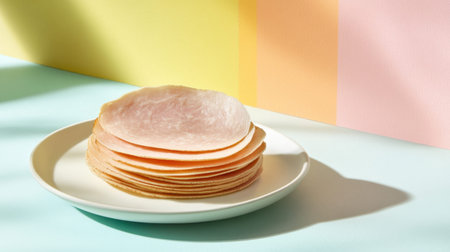 A minimalist presentation of thinly sliced deli meat arranged on a white plate, set against a colorful pastel background. Ideal for food-related themes.