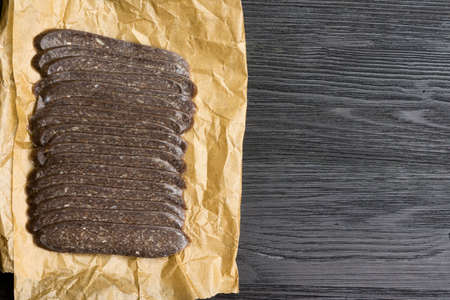 extreme closeup, detailed. salami sausage cut into thin pieces on a wooden board