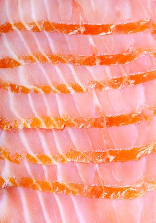 Close-up of thinly sliced pieces salmon with focus on texture and color gradation