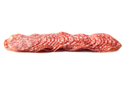 Thin sliced salami sausage isolated on white background. Thin sliced italian dry salame
