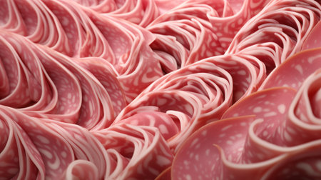 Close-up view of beautifully sliced light ham with appetizing layers that cascade, highlighting its texture and color in a macro setting.