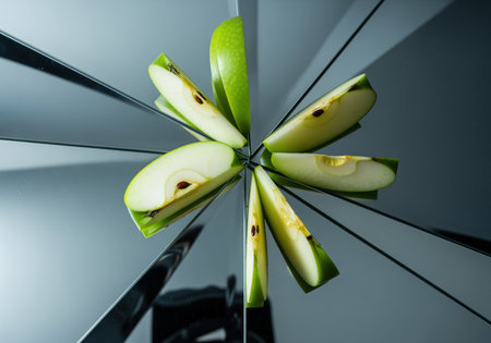 Green apple slices arranged in a geometric pattern on a dark reflective mirror, creating an abstract and modern composition. fresh fruit concept for healthy eating and design.