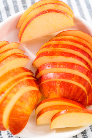 Sliced red apple wedges for a healthy snacks or to make an apple pie, close up, macro