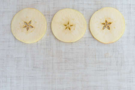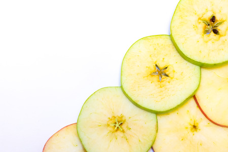 Slice fresh apple into thin sheets background on white background.