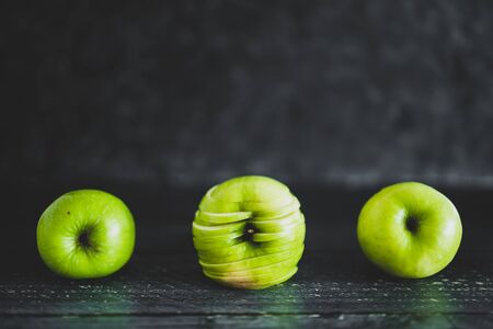 healthy plant-based food ingredients concept, green apple cut into thin equal slices stacked to maintain its original shape