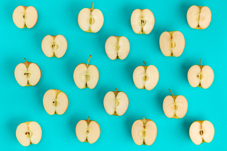 Fruit pattern on blue background. Apple halves geometrical layout. Flat lay, top view. Food background.. Pop art design, creative summer concept.